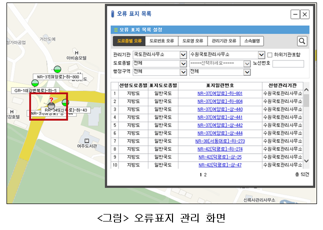 오류표지 검출 기능은 각 지역 담당자가 자신이 관리하는 표지 중 검토할 표지 목록을 좀 더 세분화하여 확인할 수 있는 기능으로 도로종별, 도로번호, 도로명, 관리기관, 소속불명 등의 잠재되어 있는 오류를 검출하여 주는 기능입니다. 오류표지는 붉은색 물음표 아이콘과 회색 아이콘을 조합하여 화면에 도시하여, 기존 표지와 구분이 용이하도록 하였고, 검색 조건으로 관리기관, 도로종별, 노선번호, 행정구역을 입력하여 원하는 오류표지 목록을 얻을 수 있으며, 행정구역 단위 오류표지 검색 기능을 추가하여 오류표지 관리 기능을 강화하였습니다.